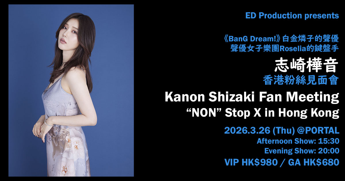 在動畫《BanG Dream!》系列中聲演白金燐子一角,同時亦是聲優女子樂團『Roselia』鍵盤手的志崎樺音將於2026年3月26日星期四在香港舉行粉絲見面會「Kanon Shizaki Fan Meeting “NON” Stop X in Hong Kong」。這次見面會除了有答問和遊戲環節之外,志崎樺音還會獻唱她的原創歌曲及翻唱動畫歌。敬請不要錯過!